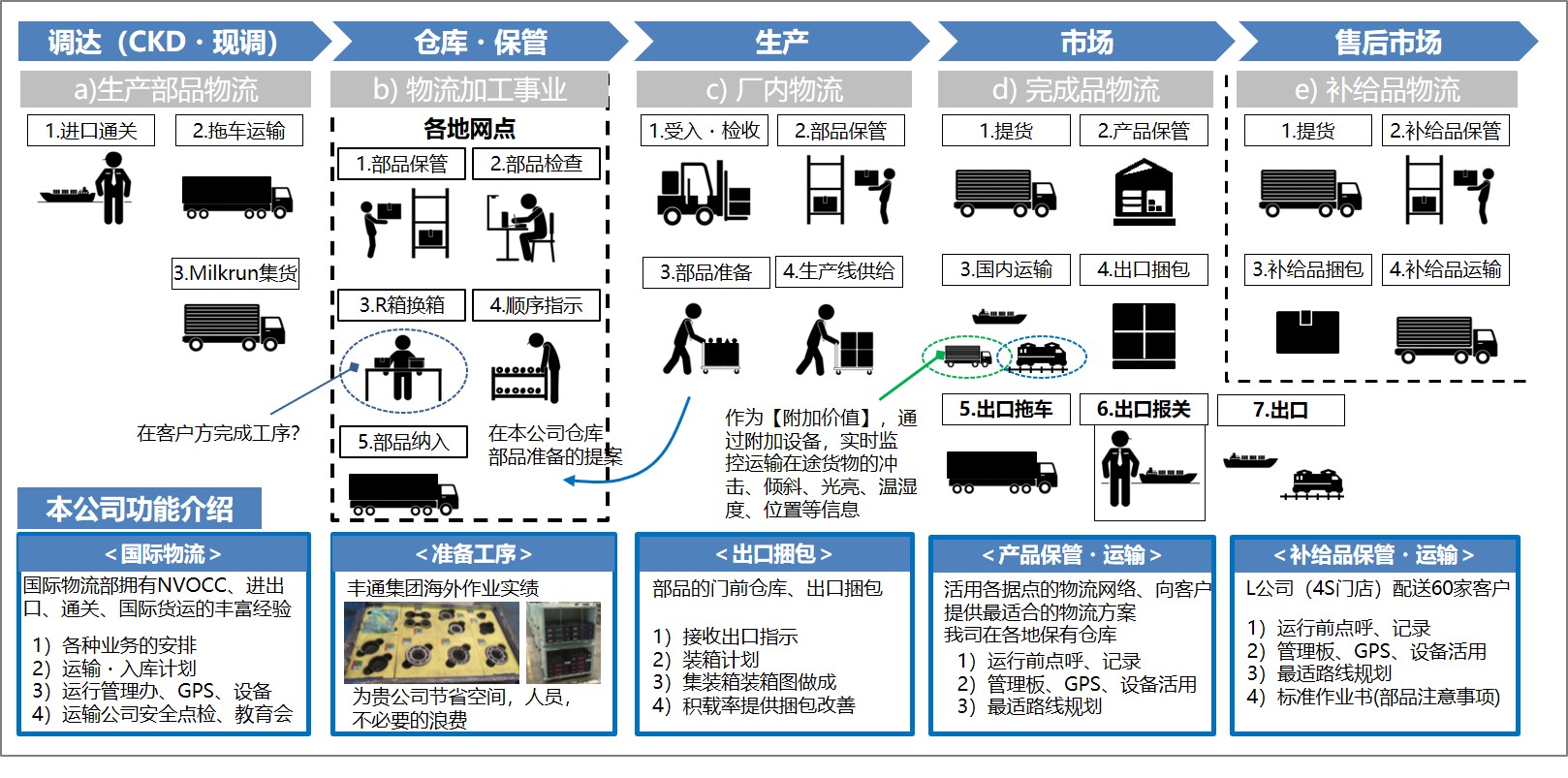 在“录用困难”、“人工费高涨”、“土地费高涨” 的改善目标下,我司希望可以协助对客户物流流程及包装规格的改善,将其客户公司的内工序(拼装工程、产品库存保管工序)以及客户公司的前后工序(国际物流、产品运输、补给品保管·运输)移交委托给本公司。