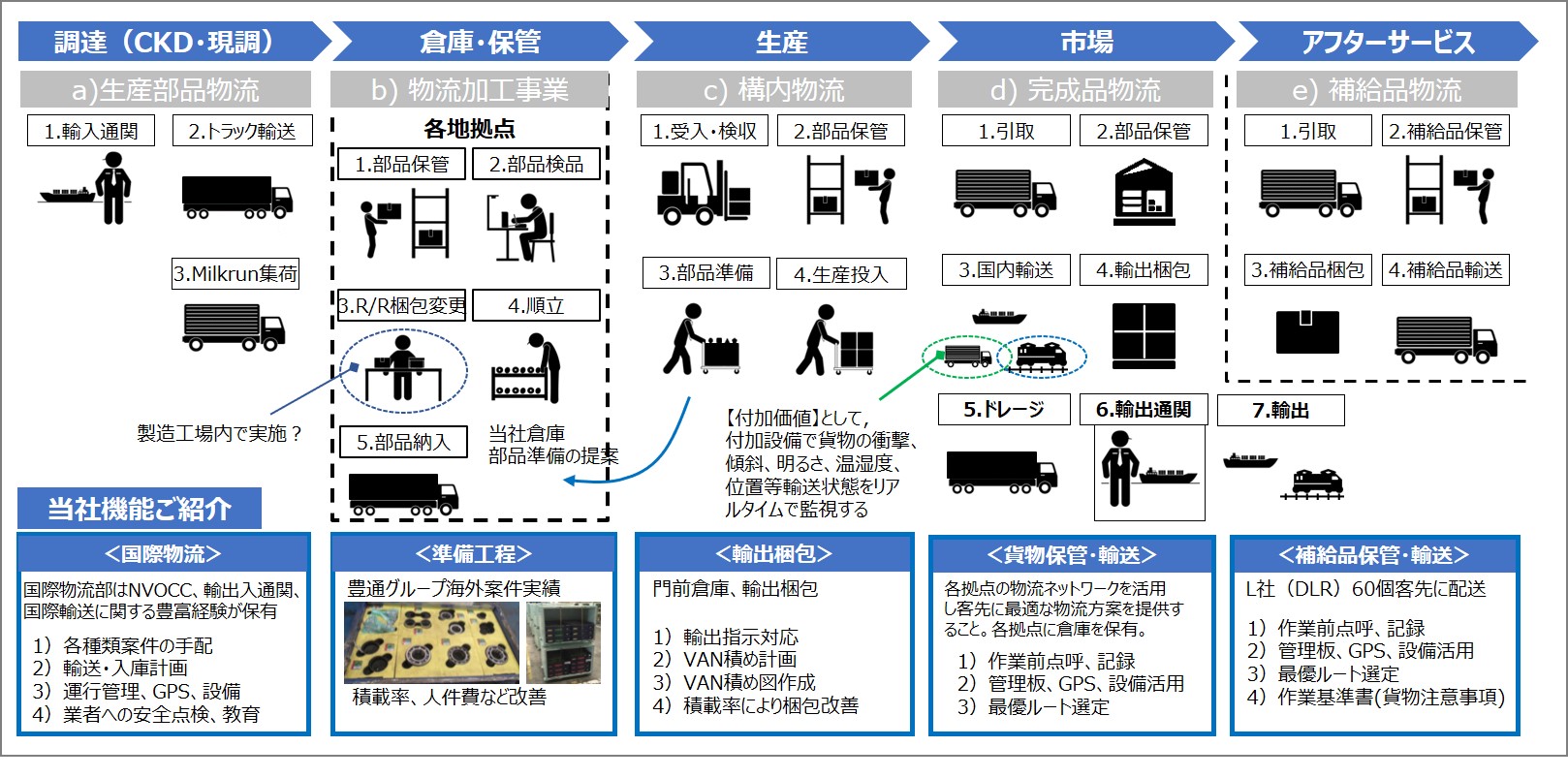 「採用困難」、「人件費高騰」、「土地代高騰」のこの地における「目指すべき姿」は、仕入先様での荷姿スペック改善の ご協力を頂きながら、貴社内工程(盛合せ工程、製品在庫保管工程)、及び、貴社前後工程(国際物流、製品輸送、 補給品保管・輸送)を当社に移管頂き.